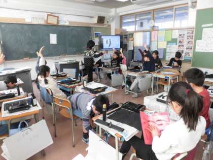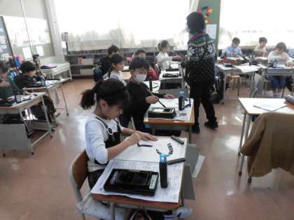 みんな姿勢をよくして練習をしています。子どもたちは筆をしっかりと立てて、字を書いています。