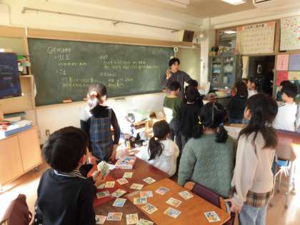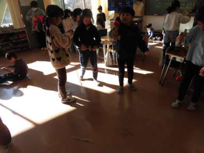 1年生は昔遊びでけん玉やカルタ、だるま落としなどを行っていました。ゲームで遊ぶことが多い子どもたちですが、けん玉でうまくお皿にのせることができたときなどは、とても嬉しそうな表情を浮かべていました。また、わたしもやらせてもらいに行きます。