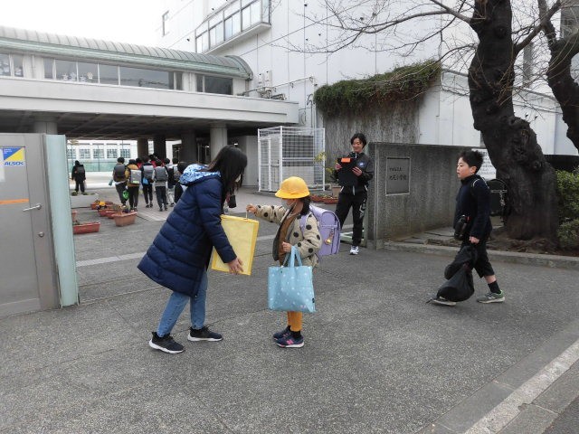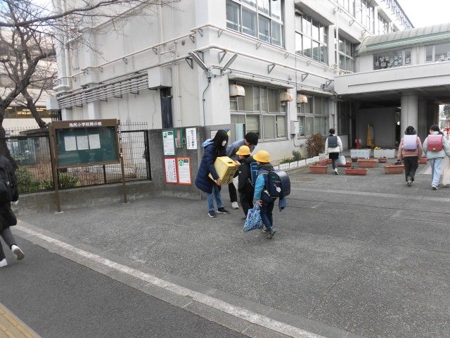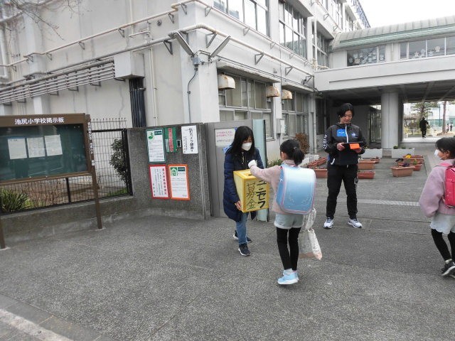子どもたちが登校してきました。今日からユニセフ募金が始まります。代表委員の人たちが持っている募金箱に子どもたちが募金を入れていきます。自分たちが恵まれた生活をしているということを意識してほしいと思っています。