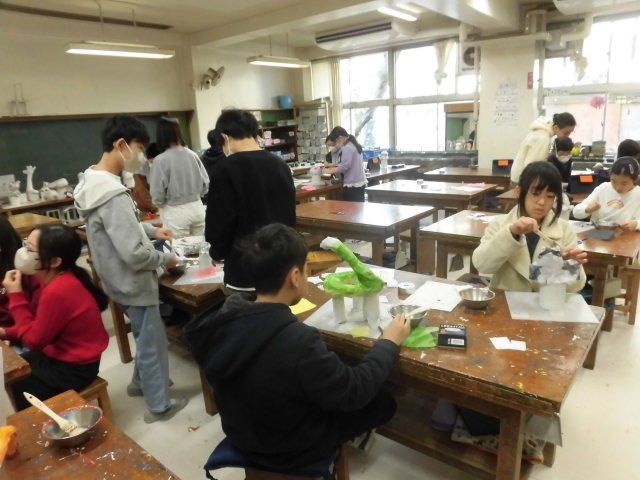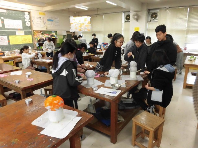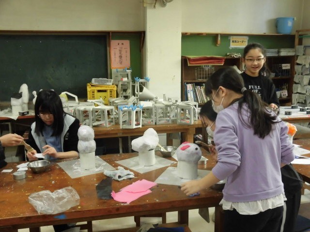 6年生の授業は図工です。張り子のランプシェードを作っています。