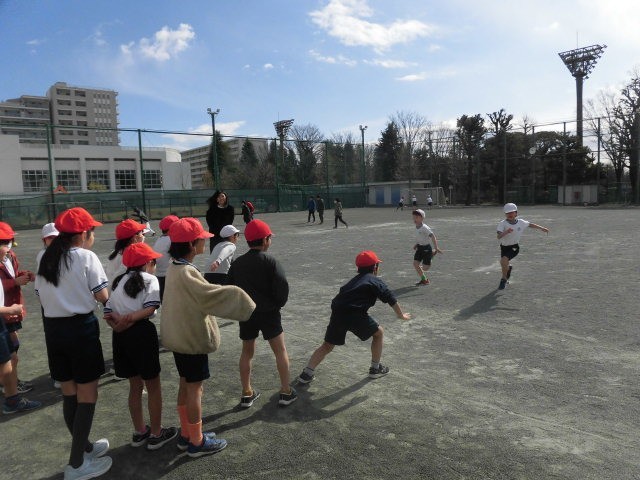 3年生が体育の時間さながらに折り返しリレーをして楽しんでいます。