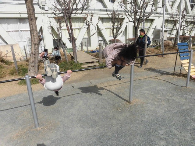 2年生は鉄棒をくるくる回っています。目が回らないか心配になってしまいます。
