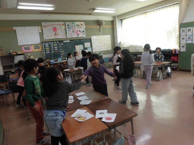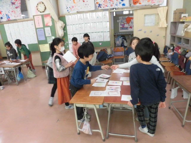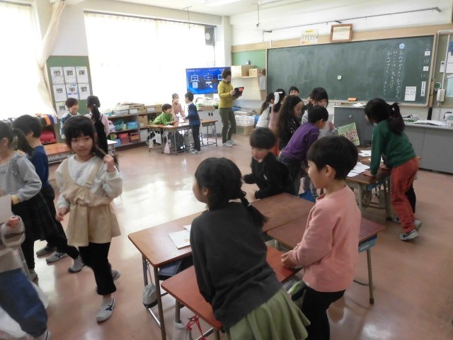 1年生の教室では国語の授業のお店屋さんごっこをしていました。店員さんとお客さんになった場合のていねいな言葉つかいの学習です。