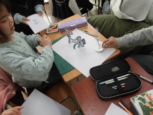子どもたちは自分を描き、絵の世界と当てはめています。子どもたちは描いた自分で、ごっこ遊びのようにいろいろな世界を楽しんでいます。