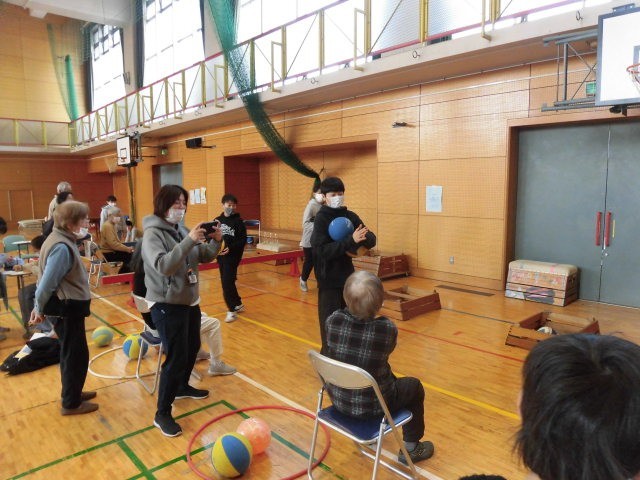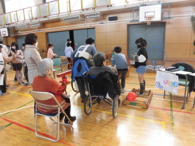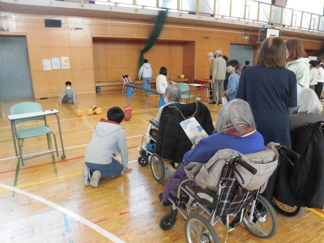 デイホームの方々は、子どもたちの考えたスポーツを楽しんでくださっています。やり方などが分からないときは、子どもたちが教えてあげています。デイホームの方々も笑顔です。地面に膝をつき優しい笑顔でお話をする6年生の姿もあり、とてもあたたかい気持ちになります。