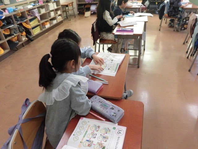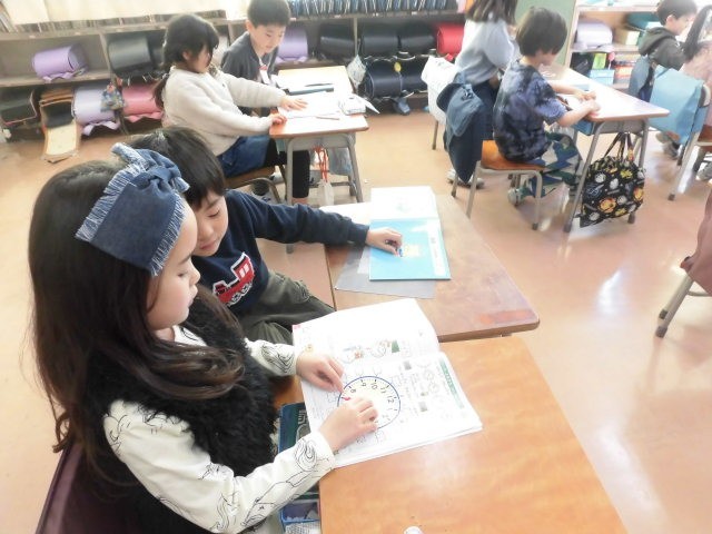 教科書についている針を使って、友達と問題の出し合いっこをしている1年生です。