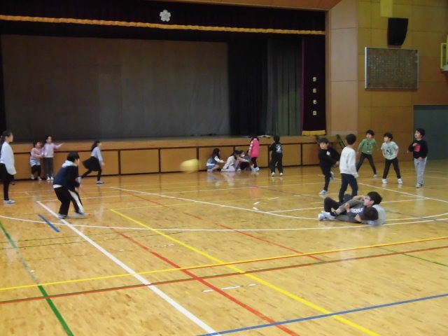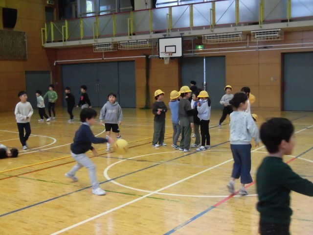 今日は雨のため、校庭では遊べません。体育館で遊ぶことができるのは1年生と2年生です。ボール遊びやおにごっこなど、体育館の中で思い切り身体を動かしています。