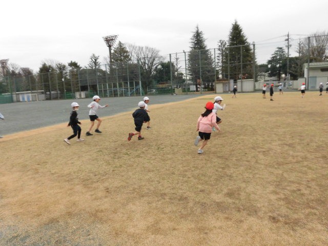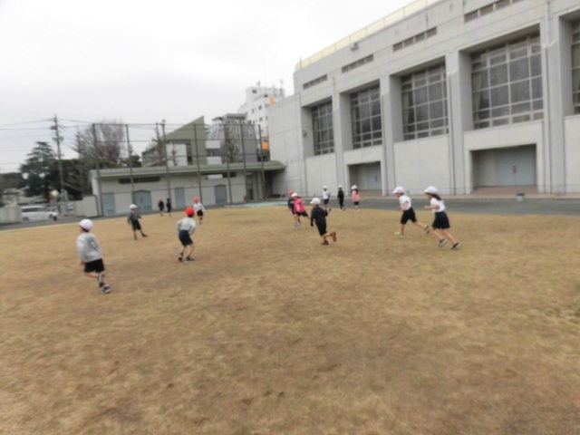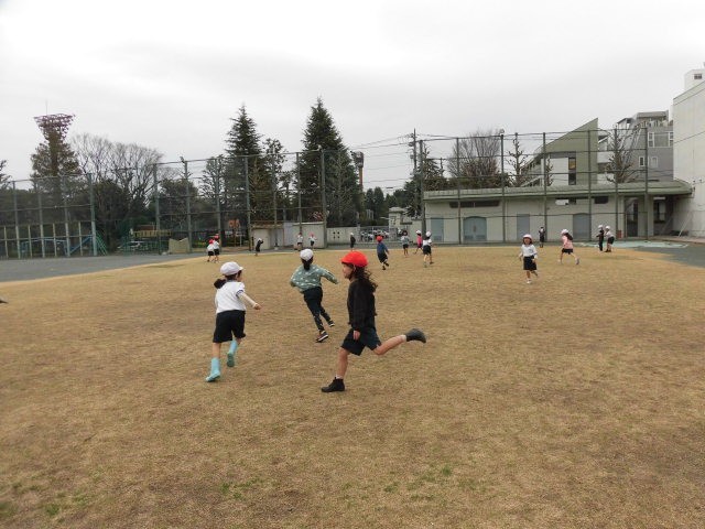 この寒さなので、はじめにおにごっこをして身体をあたためています。しばっちが逃げられる範囲のようです。しかし、1年生にとってはとても広く感じるのでしょう。オニになった人は、頑張って走っていますが、なかなか交代できないようです。しかし、子どもたちはとても声をあげながら楽しそうに芝の上を走り回っています。