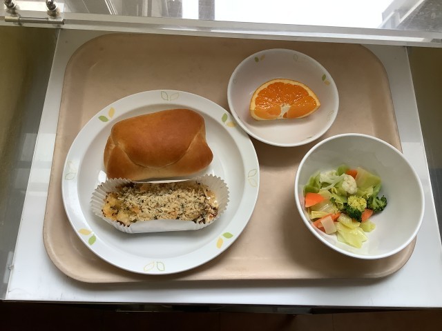 牛乳・ダイスチーズパン・いわしのガーリック焼き・花野菜のサラダ・果物(清美オレンジ)