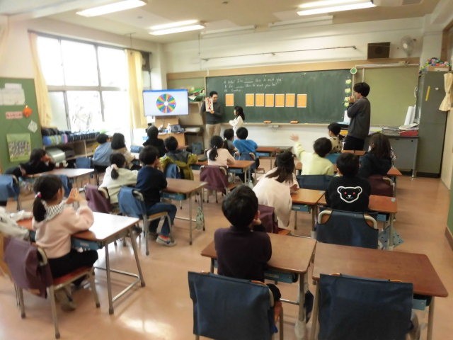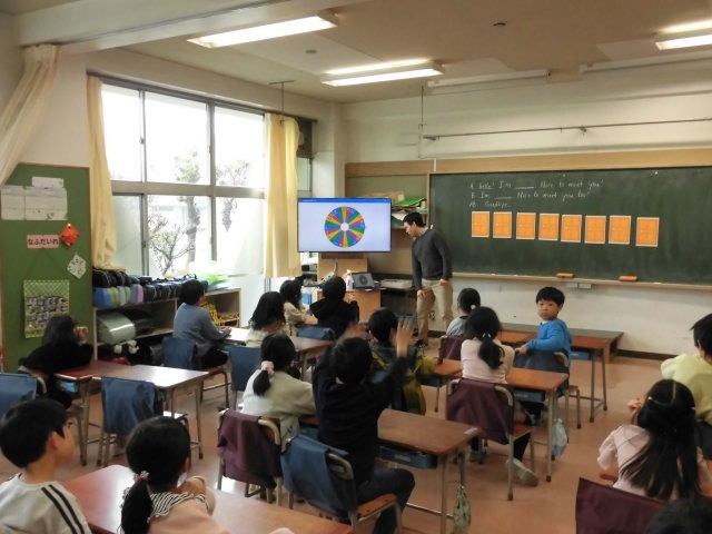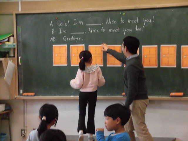 黒板に貼られているドアをノックして出てきたキャラクターとあいさつをします。