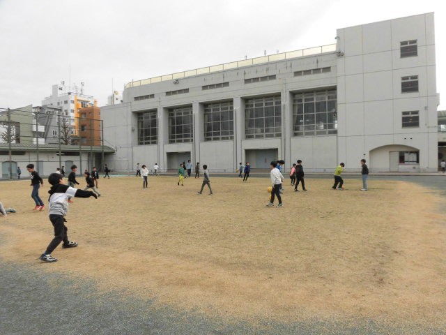 昼休みです。子どもたちが校庭に出てきました。子どもたちは元気に遊んでいます。