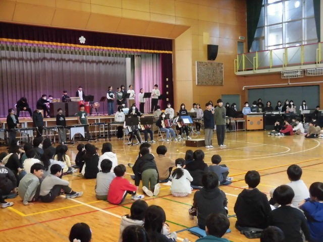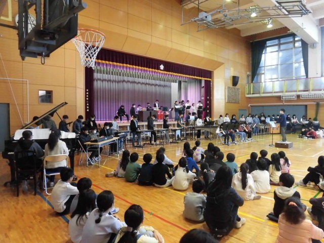 たくさんの楽器がステージ前に並び、6年生が演奏をします。全校のみんなは、6年生の演奏に聴き入っていました。