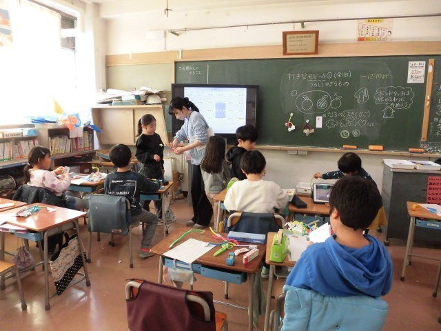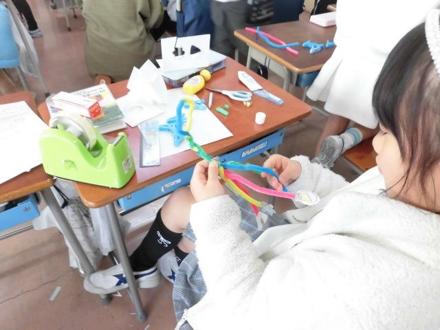 2年生の授業は図工です。モビールを作っています。先生が作った見本を見ながら、子どもたちは楽しそうに作っています。