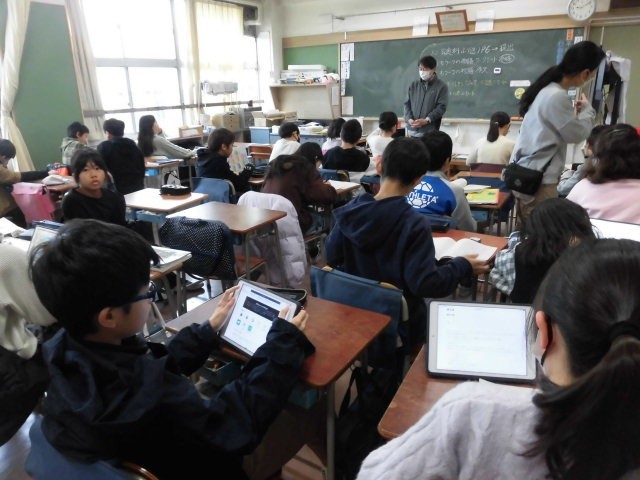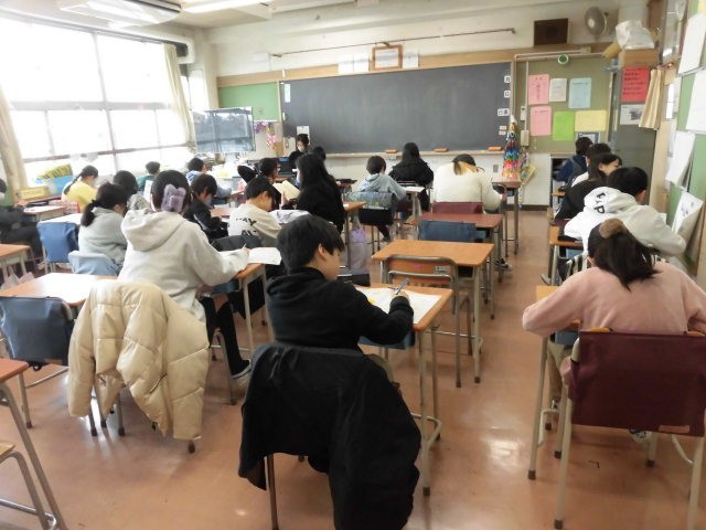 5年生の教室では各自でプリントやまだ終わっていない課題を一人ひとり取り組んでいました。学期末が近づき、取り組み状況に応じて、行うことが変わってきています。