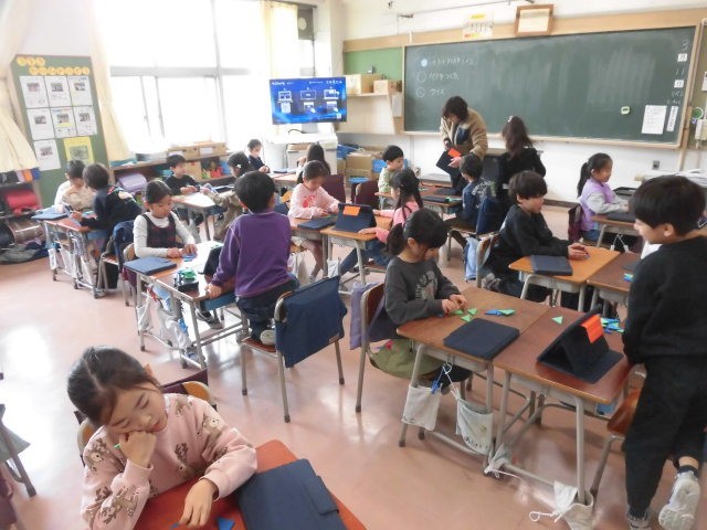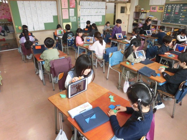ペアで問題の出し合いっこをしています。三角形を組み合わせて事前に作った形を、ペアの友達に作ってもらいます。題して、「シルエットクイズ」です。子どもたちは、その形になるように、三角形の板をいろいろな方向に並べています。楽しみながら形の学習をしています。