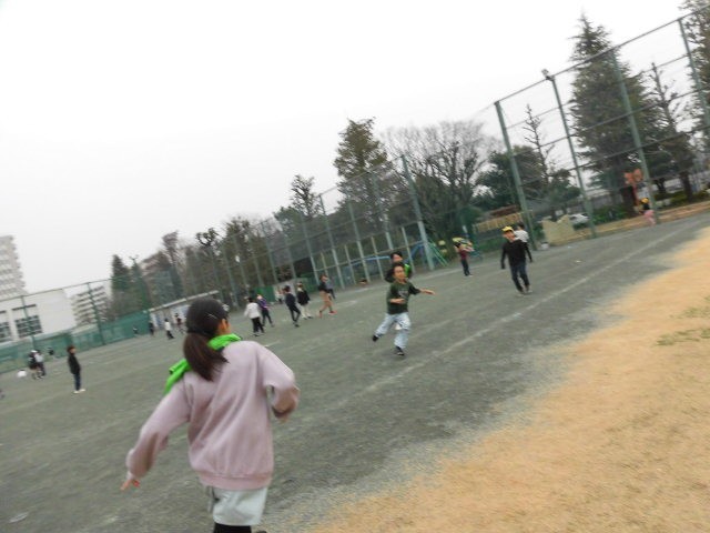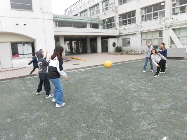 休み時間になりました。6年生と4年生が一緒にドロケイをしています。6年生と一緒に遊ぶことができて、4年生はとてもうれしそうです。