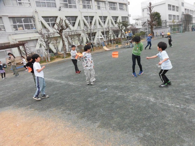 紙飛行機で遊んでいる2年生がいました。滞空時間が長く、空を泳いでいるような飛行機です。すごいです。