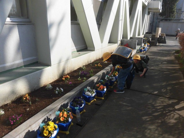 登校した1年生が自分の育てている花をながめています。