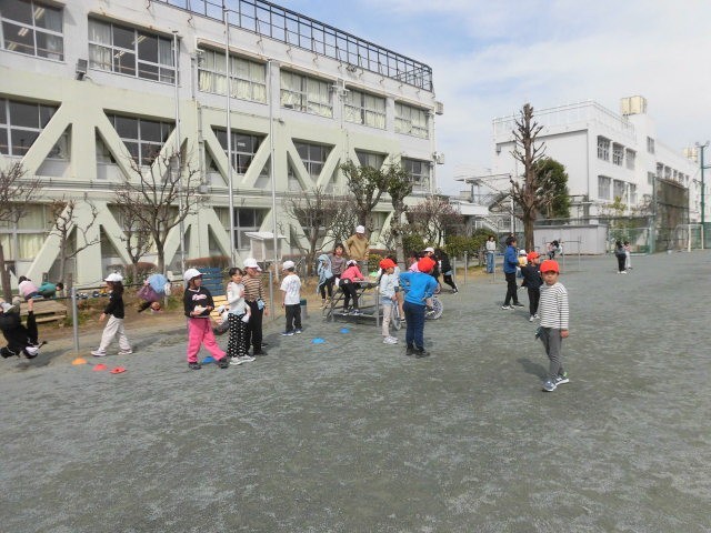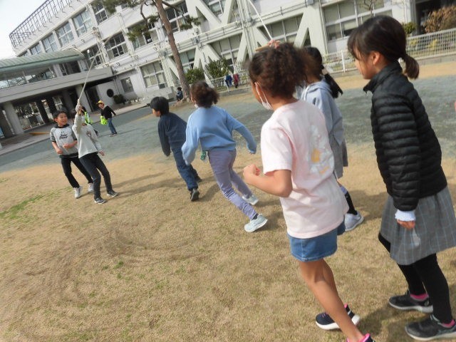 4年生は長縄で遊んでいます。1年生はドロケイをやっているようです。ほかにもおにごっこなどをしている人がたくさんいます。