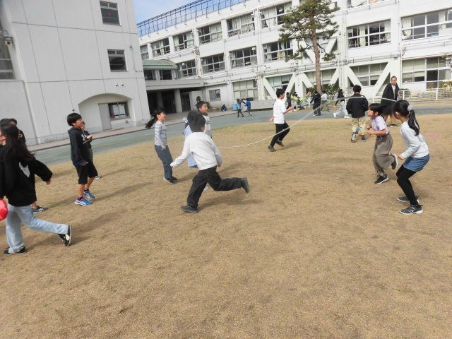 4年生が長縄をやっていました。わたしも一緒にやろうと思い寄っていくと、近くに6年生がいました。4年生と一緒に遊びたいと思ったようです。4年生に声をかけると、もちろん大賛成の声。4年生の長縄に6年生が入りました。すると、2年生も入り、三つの学年が混ざって遊び始めました。とてもすてきなことです。