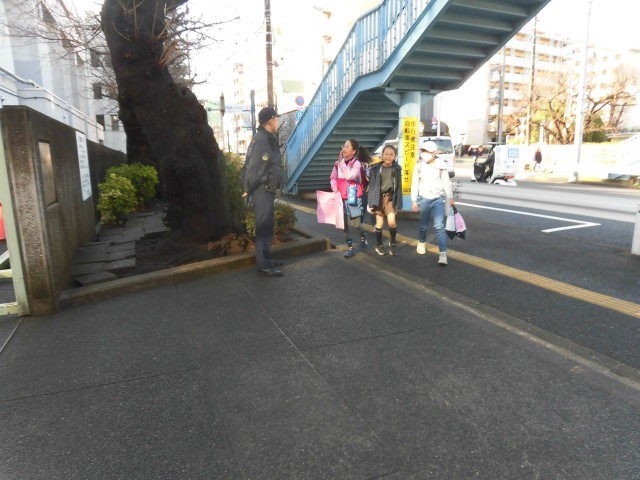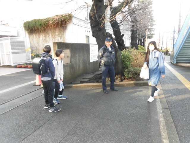 雨も上がり、とてもあたたかい朝です。おまわりさんが子どもたちを見守ってくれています。おまわりさんと楽しそうに話をする子どもたちもいます。