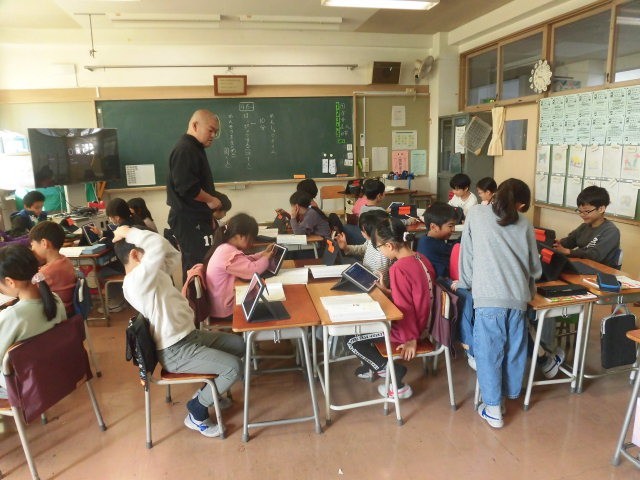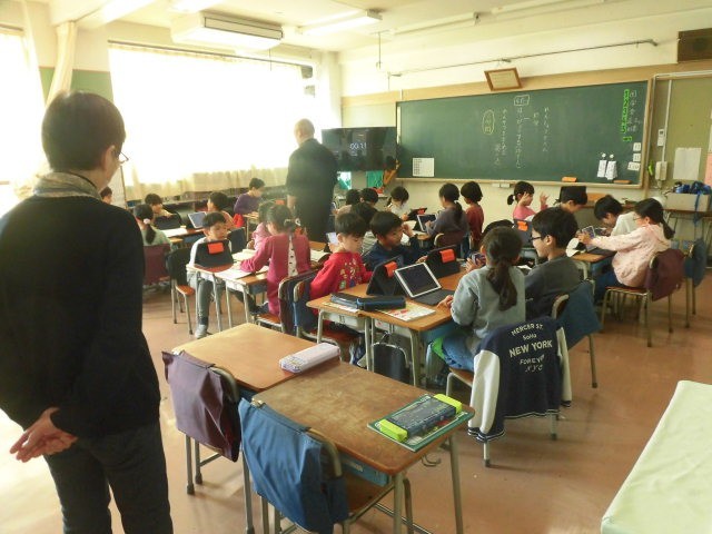 友だちの発表を聞いて、感想などのコメントをタブレットに書き込んでいます。もらったコメントを読んで嬉しそうにしている人もいます。