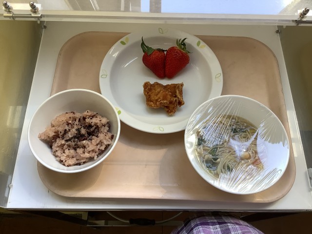 牛乳・赤飯・竜田揚げ・あんかけ汁・果物(いちご)