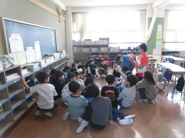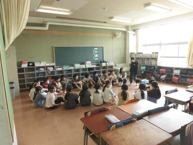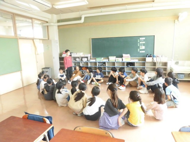 3年生の教室では、すべての机を前に動かし、丸くなって座って自己紹介をしていました。お互いの顔を見合いながら自己紹介をしています。友達の話を聞いて、みんな楽しそうです。みんなが笑顔の自己紹介です。