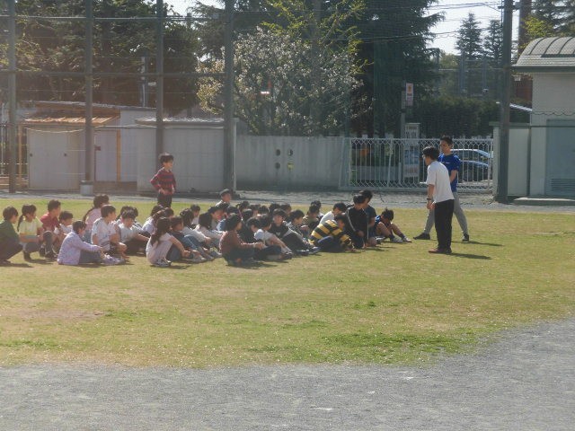 4年生は学年で校庭に集まり、学年レクをしていました。はじめに担任の先生がみんなに話をしています。