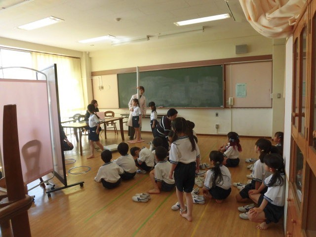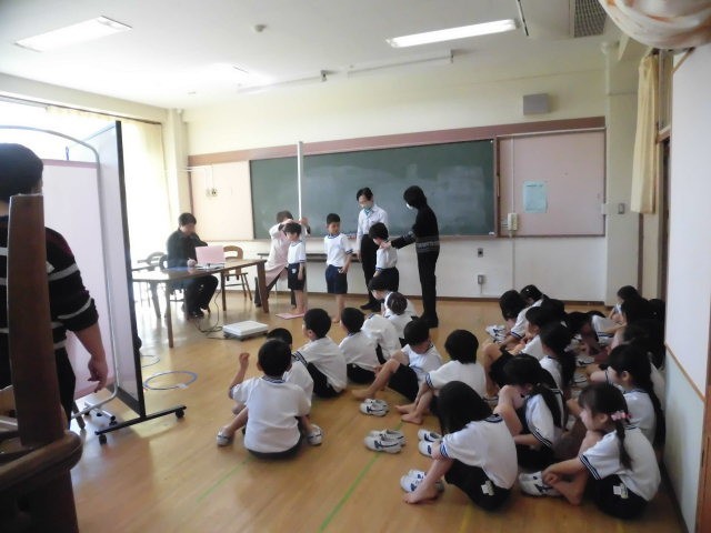 1年生は体操着に着替えて発育測定をしていました。1年生は体操着に着替えるのも初めてです。着替えるのも大切な学習です。