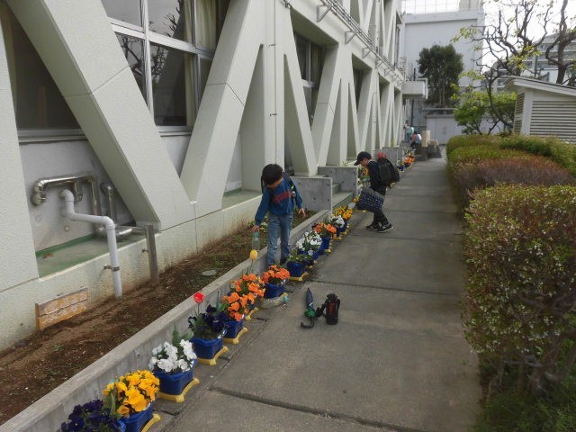 早く登校した2年生が、育てているお花に水をあげています。言われて行っているのではなく、自分からそのように行動しているところがとてもすてきです。植物を大切にする子どもたち、見ていてあたたかい気持ちになります。