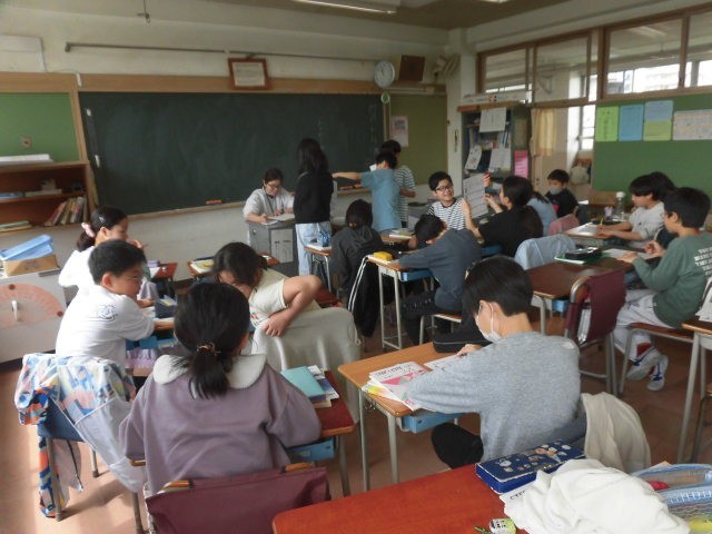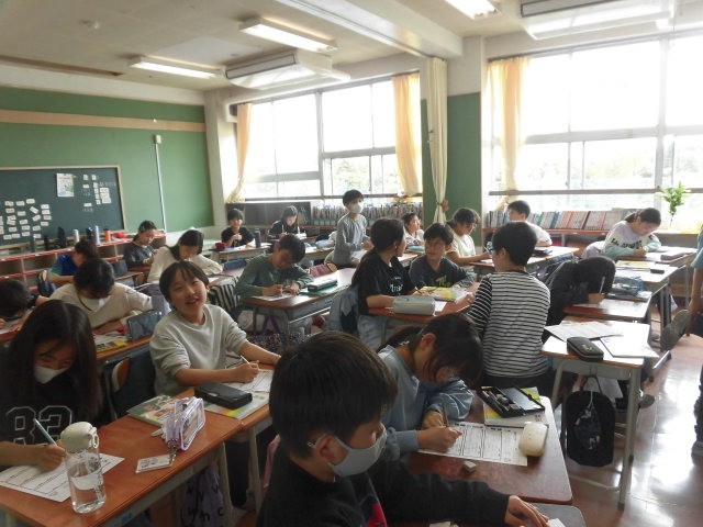 6年生の教室では、今学期のめあて表の記入をしていました。枠の中に小さな字でたくさん言葉を書いている人もいます。6年生の字はとてもていねいです。最高学年として、今、意欲的に活動している6年生、みんな一生懸命に取り組んでいます。