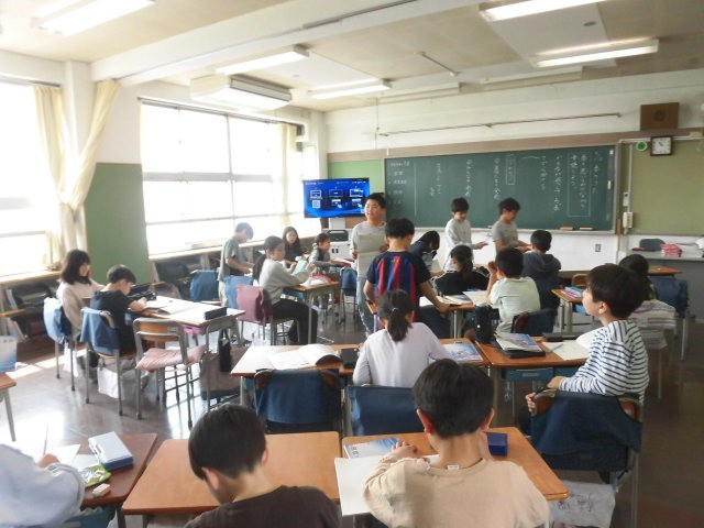 4年生の授業は国語です。詩をよんで感じたことを友達と伝え合っています。教室の中をまわって、いろいろな友達と考えを伝え合っています。立ち歩いているのですが、よけいな話をしたり、ふざけたりしている人は誰もいません。しっかりと学習に取り組む4年生です。