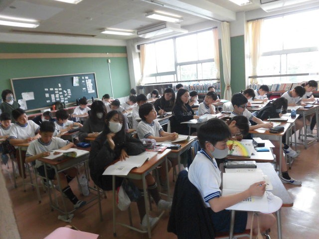 6年生の教室をのぞきました。一つのクラスは、国語の授業で一人ひとり文章をノートに書いていました。もう一つのクラスは今学期のめあて表の記入をしていました。