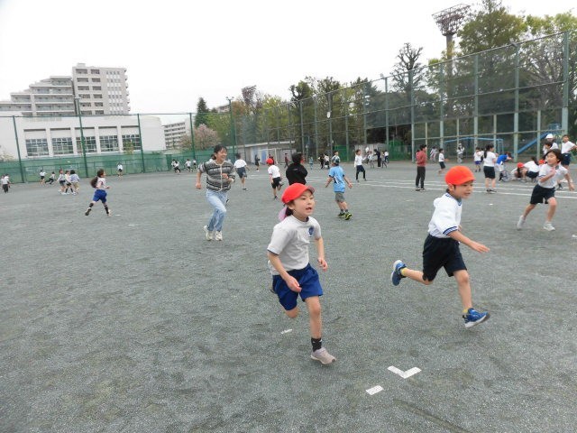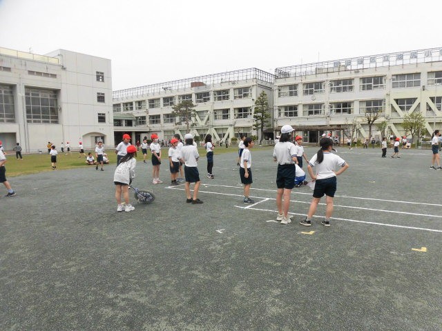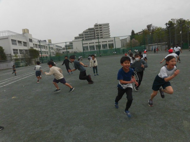 子どもたちは校庭を走っています。おにごっこ、どろけい、とにかく走り回っています。5年生は、校庭に引いてあるラインを使ってかけっこをしています。写真は並んで順番を待つ子どもたちです。