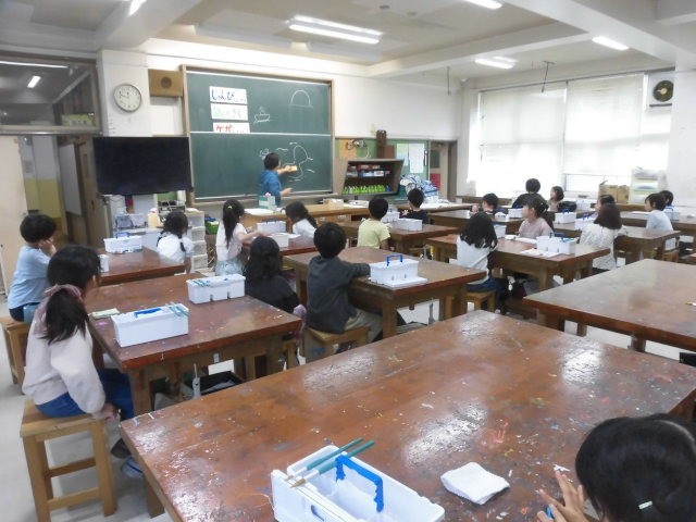 2年生の授業は図工です。図工専科の先生の初めての授業です。