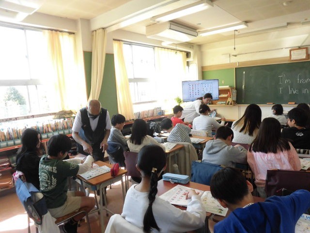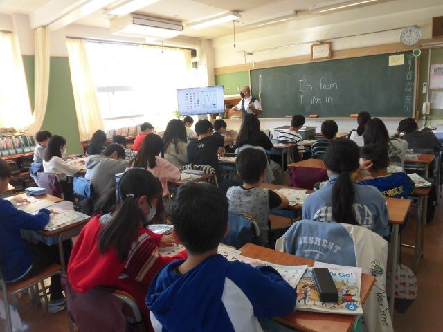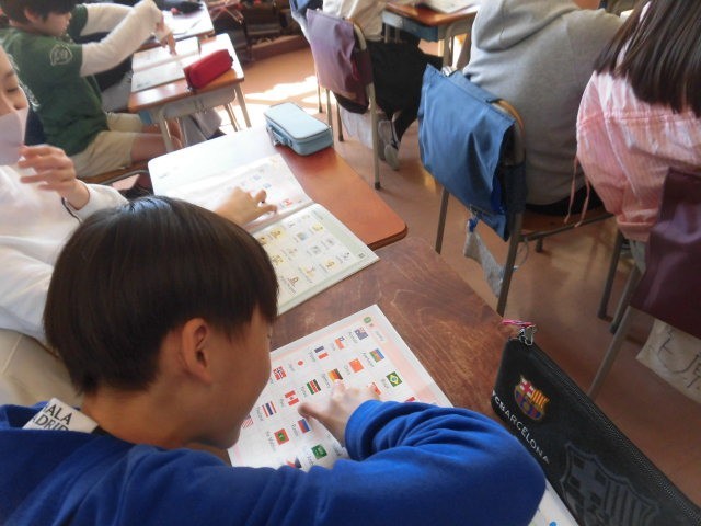 6年生の授業は外国語です。ALTの先生の授業です。世界各国の国旗を見ながら、指でツインスターゲームをしています。ALTの先生の言う国の国旗を指でおさえていきます。とてもつらそうな人もいれば、「楽勝だよ。」と、言っている人もいます。みんな楽しそうです。