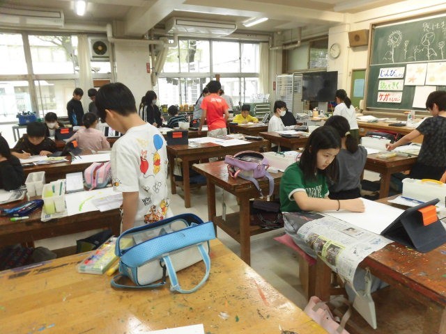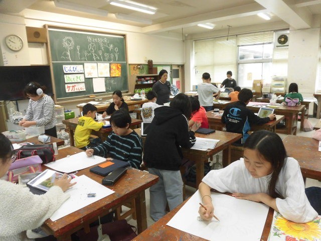 6年生の授業は図工です。「感じるままに花」と題して、花の絵を描いています。
