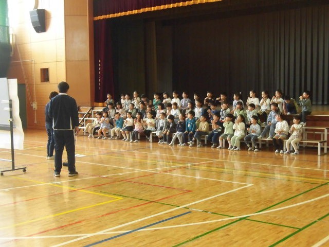 1年生は学年全体で体育館に集まっています。来週行われる1年生を迎える会の出しものの練習をしています。