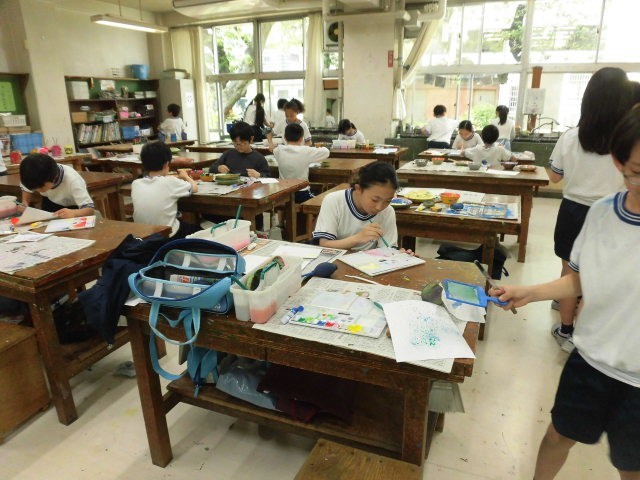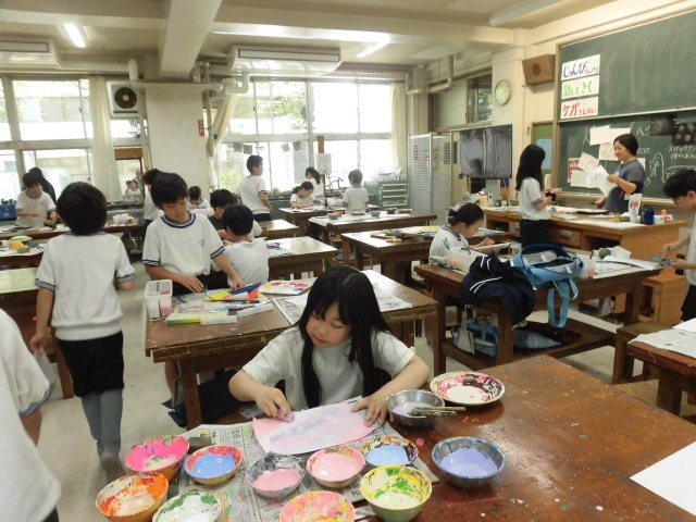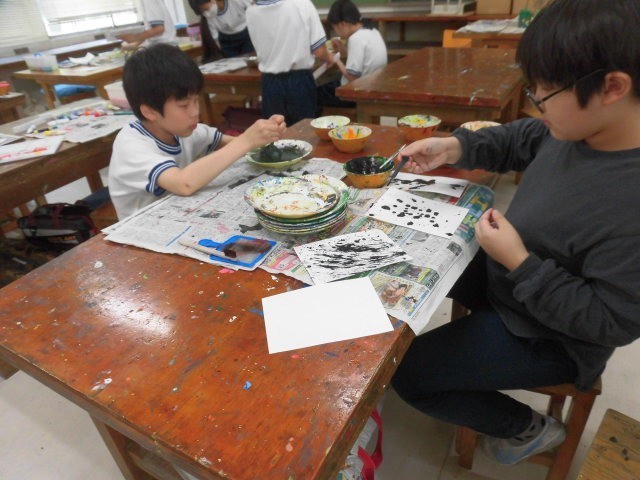 5年生の授業は図工です。いろいろなものを使って、絵の具でいろいろな技法を試しています。