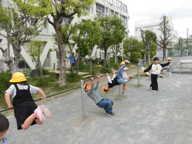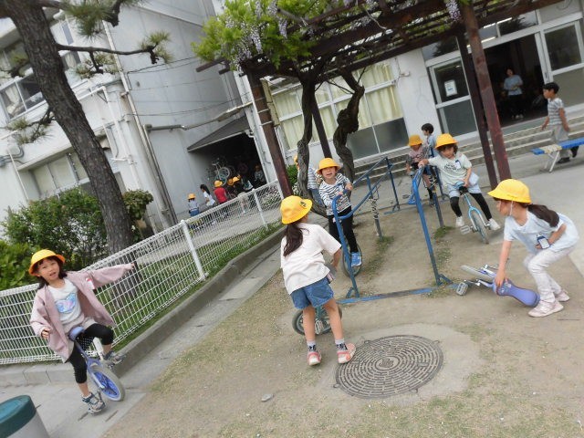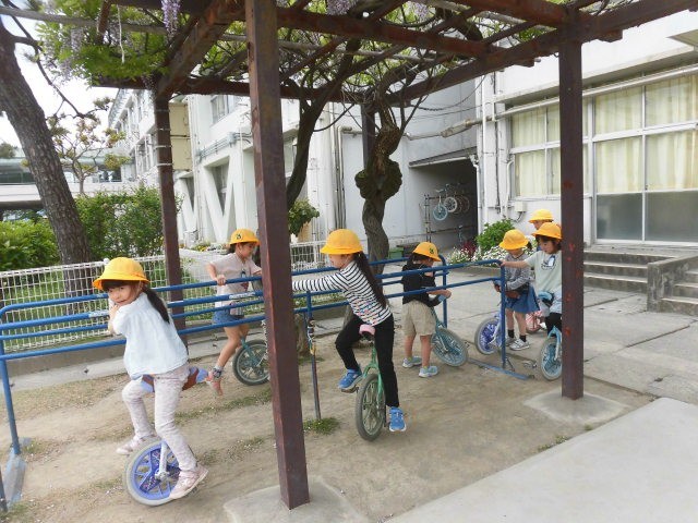 今日の中休みから1年生が校庭での遊びができるようになりました。たくさんの1年生が一輪車をしています。