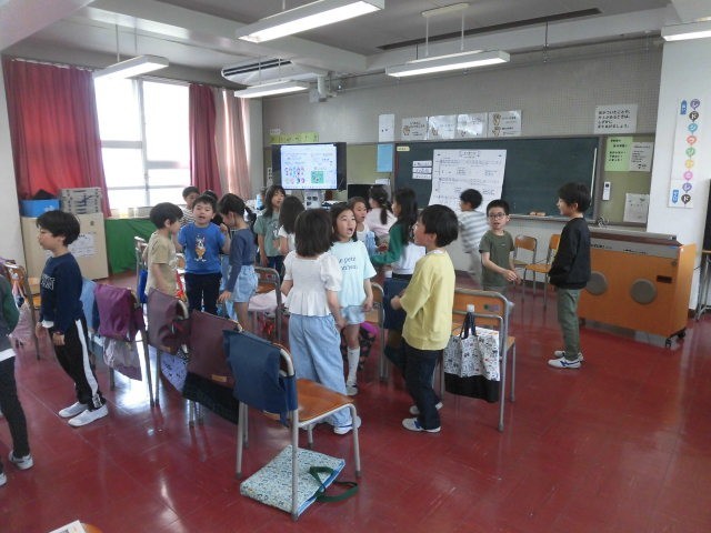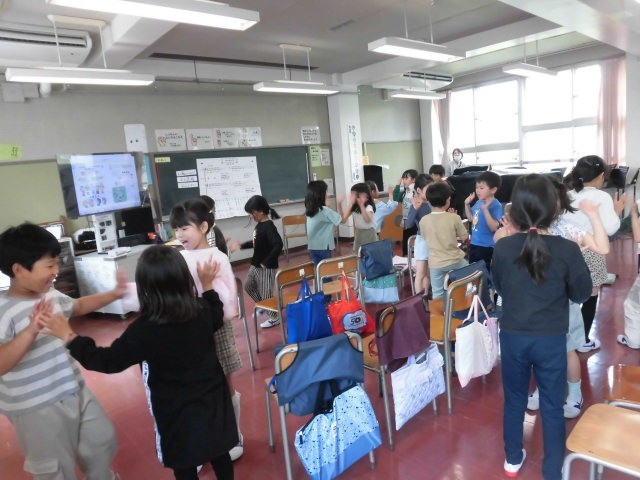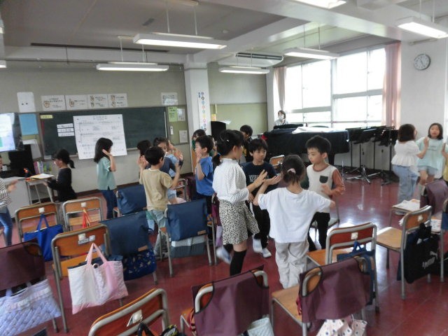 2年生の授業は音楽です。「子犬のビンゴ」の曲に合わせて、リズム遊びをしています。