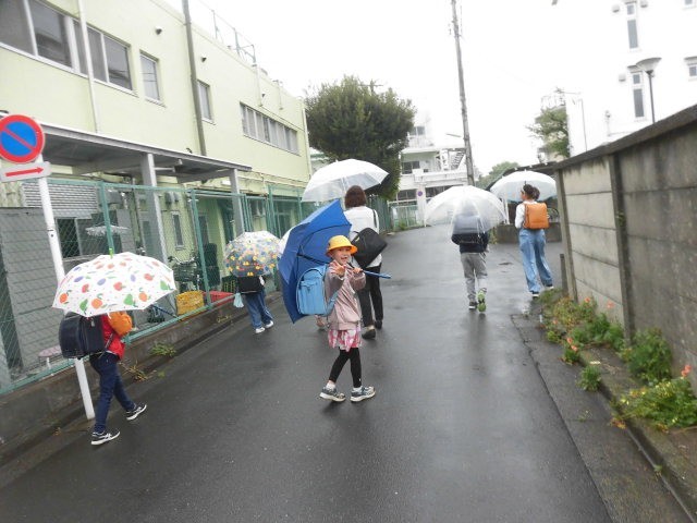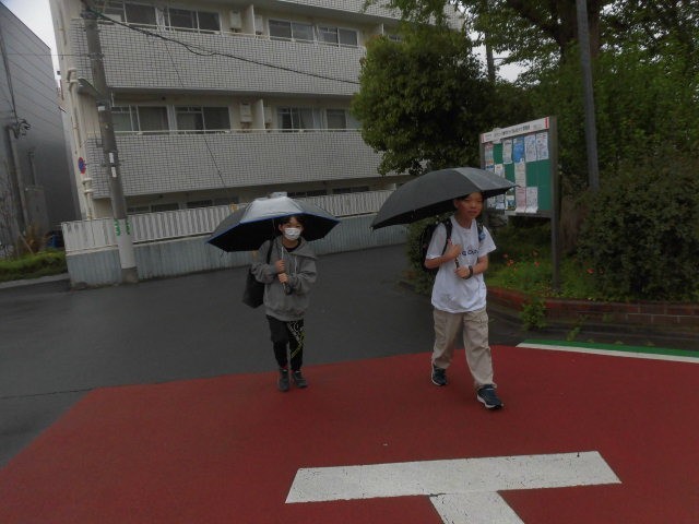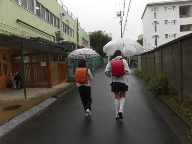 子どもたちが登校してきました。あいにくの雨が降っています。