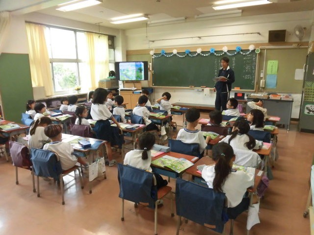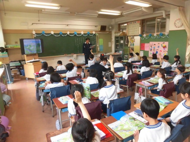 1年生の授業は国語です。教科書を開いて、挿絵から分かることを挙手して発表しています。