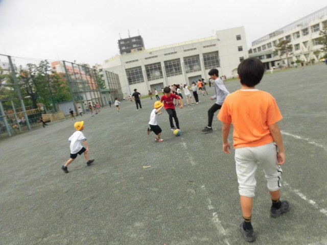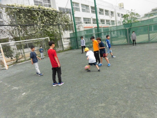 今日は6年生とサッカーをして遊びました。6年生の中に数人の1年生が混ざっています。普段6年生は、ものすごい勢いでサッカーをして楽しんでいます。ゴールが使える曜日になると急いで校庭に出てきて、サッカーを始めています。そして、ものすごい勢いでサッカーを楽しんでいます。それほど、みんなサッカーが大好きなのです。