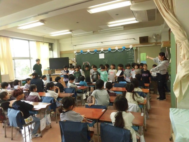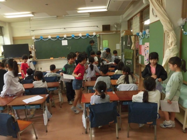 1年生の教室をのぞいてみると、2年生がみんなで黒板の前に並んでいました。今度行う学校探検の顔合わせのようです。2年生が同じグループの1年生にあいさつに来たのです。