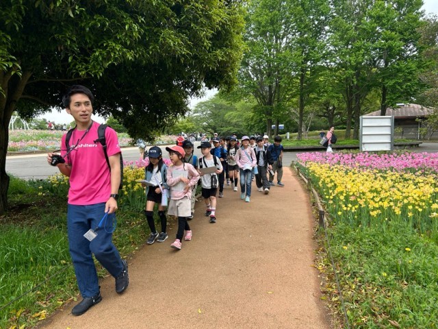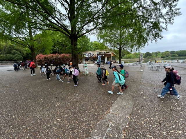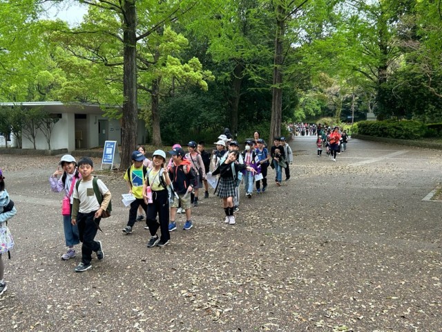 広場まで、クラスごとに列になって歩きます。お花がとてもきれいです。ここに住みたい!と、言っている人もいます。