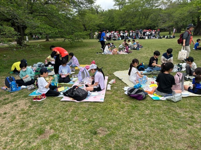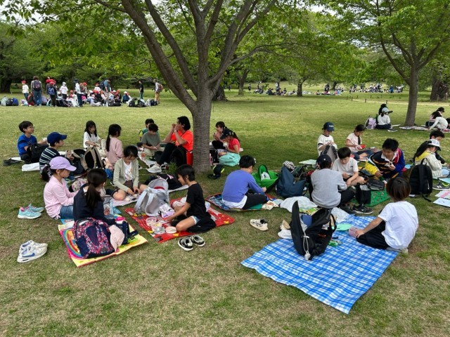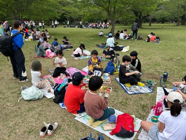 縦割り班でまとまってお弁当を食べます。みんな嬉しそうです。