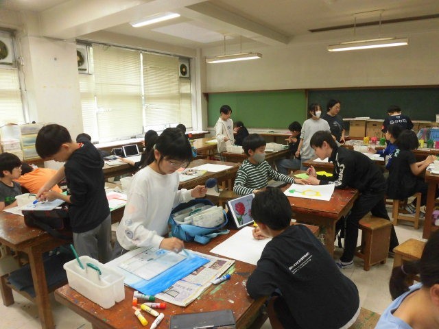 いろいろな色を作っています。「これ、夜の色だよ。」そう言いながら、パレットを見せてくれる人がいました。イメージに合わせた色を創り出しています。