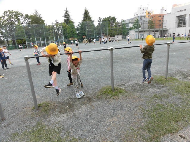 1年生が高い鉄棒にぶら下がっています。上に乗ろうとして一生懸命にとび上がっています。その姿もとてもかわいらしいです。